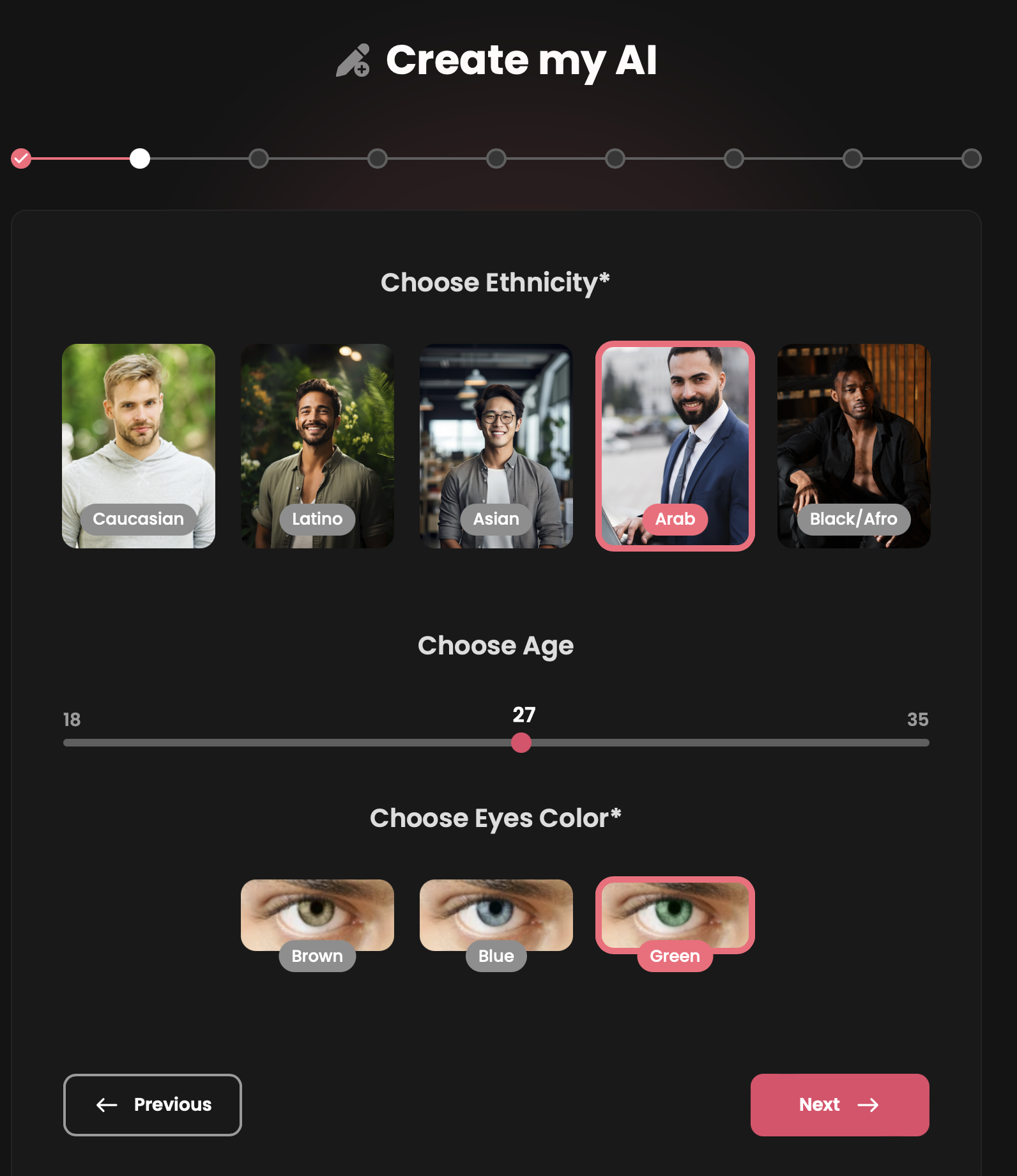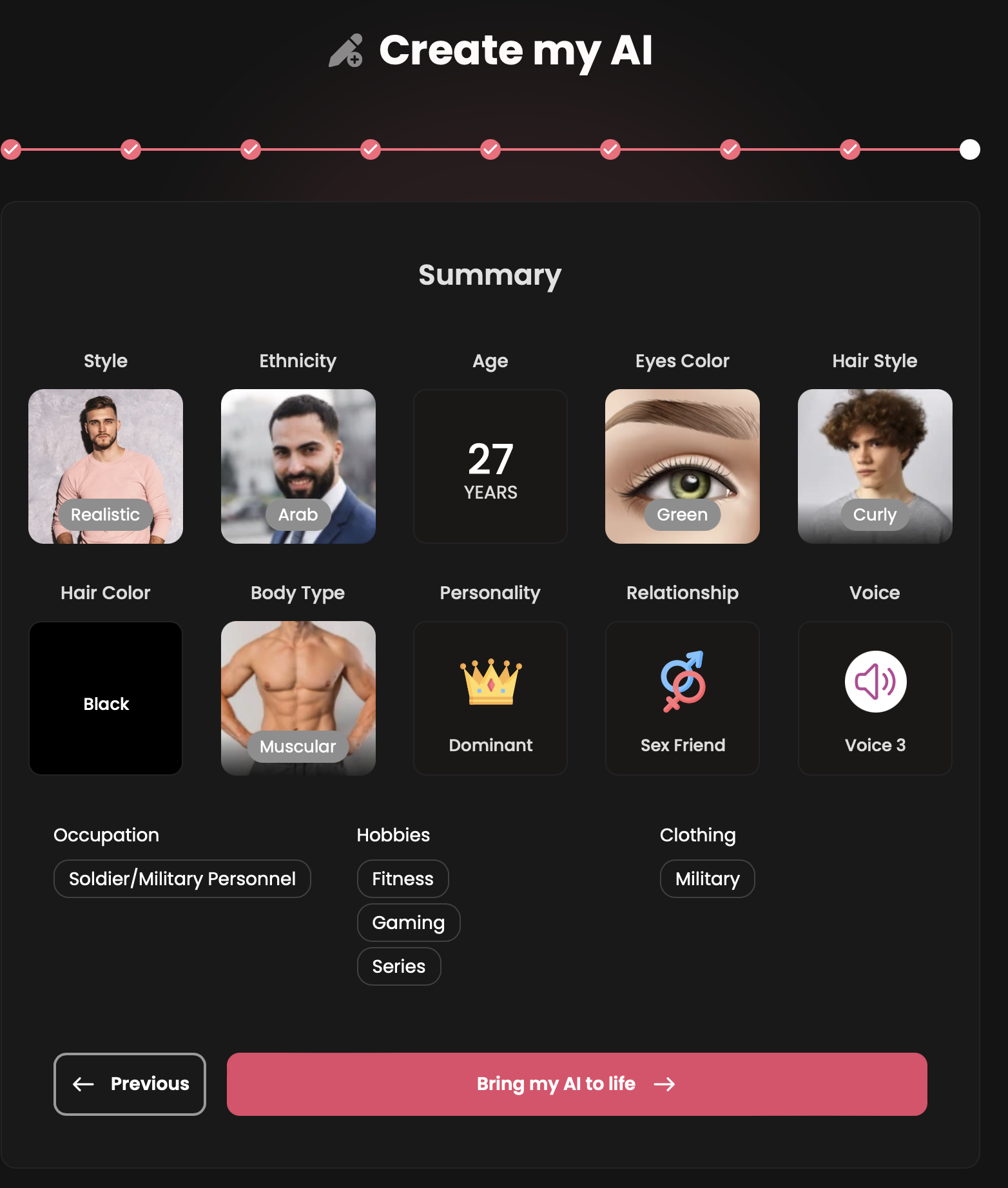 9 étapes qui permettent de sélectionner l’ethnie (sélectionner arabe), l’age, les yeux, cheveux, le corps, la personnalité, la voix et le type de relation que vous souhaitez avec le personnage. Cette étape est importante car elle définira le type d’échange que vous aurez.