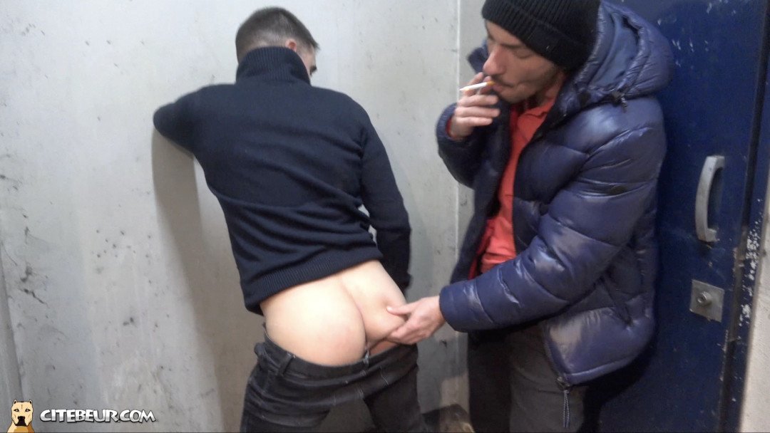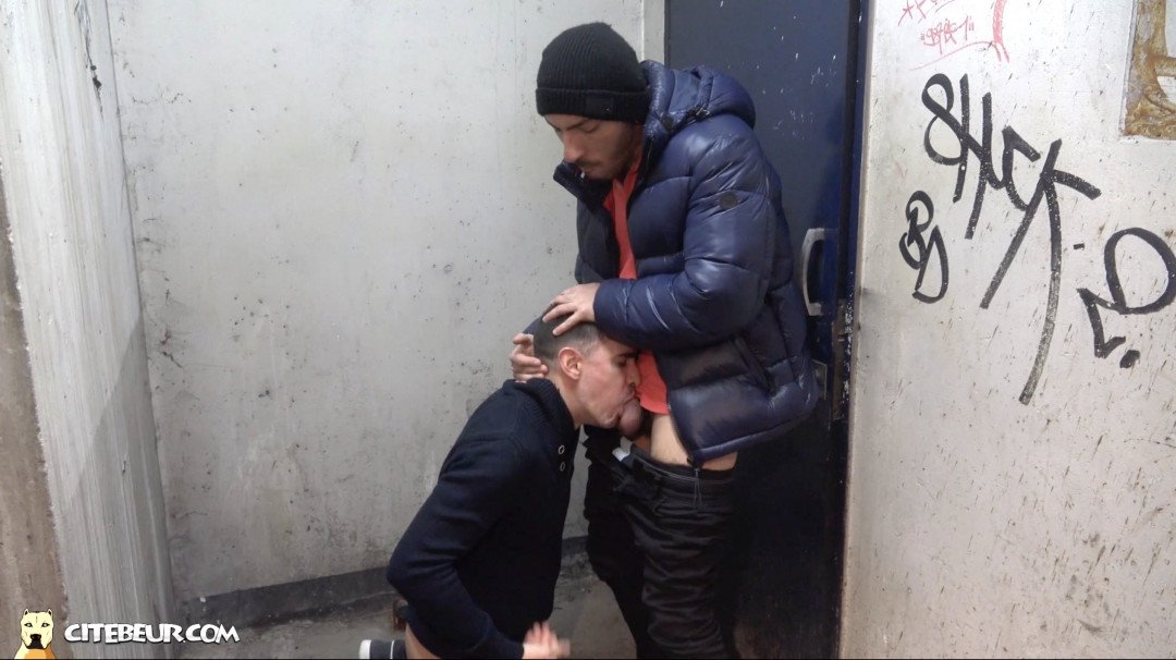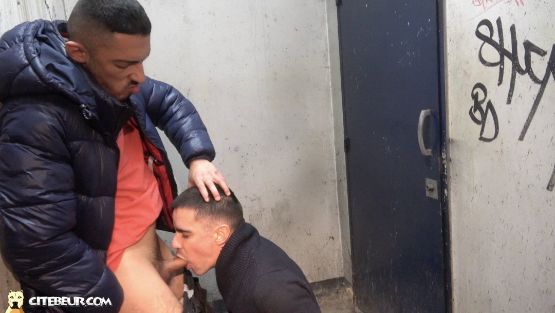 Juan entraîne David vers les caves de l’immeuble — ambiance brute, néons froids, tension électrique. David s’agenouille de son plein gré, capte le regard de Juan et commence à le servir, appliqué, concentré. Le lascar maintient le rythme d’une main sûre pendant que David gère la profondeur à son tempo, respirations calées, consentement répété.
