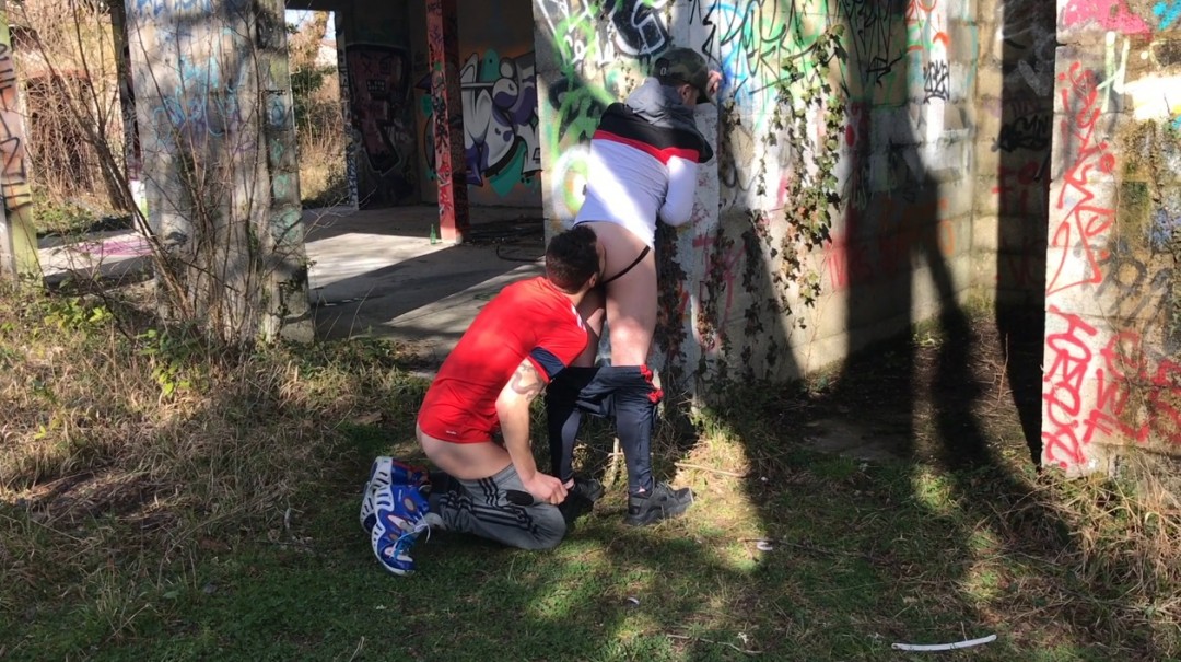 Koldo veut plus qu’un simple plan suce et le fait comprendre. Ils se décalent vers l’extérieur, le lascars se met en position, jockstrap bien en vue. Koldo écarte, passe la langue entre les fesses, fait monter la fièvre : le partenaire frissonne, clairement dedans.
