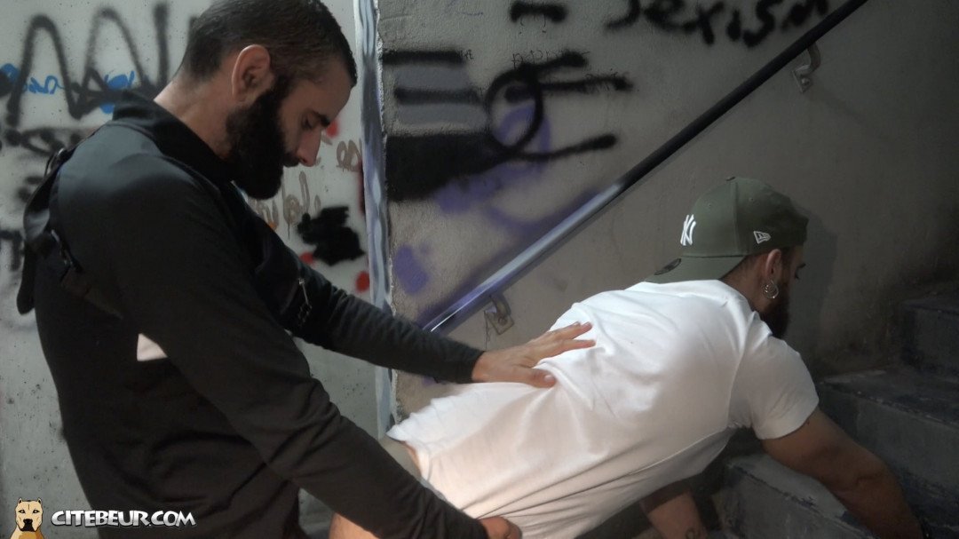 La séance continuera sur plusieurs positions : contre le mur, au sol, puis sur les marches. Un vrai plan de mecs, brut, rythmé, sans prise de tête. Mathieu gémira à chaque coup de rein, son corps suivant le tempo du dominant. Kader, concentré, ne lâchera rien, profitant du moment jusqu’à sentir la tension monter au plus haut.